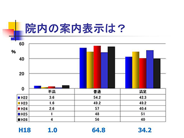 その他の、病院の案内掲示や、清潔度についても、過去と同じような評価ですが、良くなってきているものもありました。